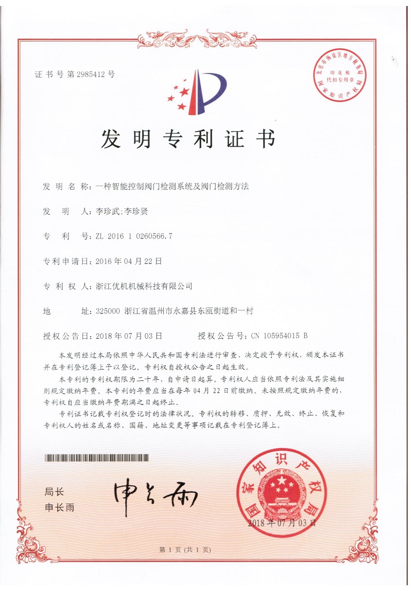今年4月浙江優(yōu)機機械科技有限公司《一種閥門檢測設(shè)備》發(fā)明專利,獲得國家知識產(chǎn)權(quán)局授權(quán)。捷報連連該公司16年申請的一種智能控制閥門檢測系統(tǒng)及檢測方法已在2018年7月03日授權(quán)公告,公告號:CN105954015B發(fā)明專利號:ZL 2016 1 0260566.7