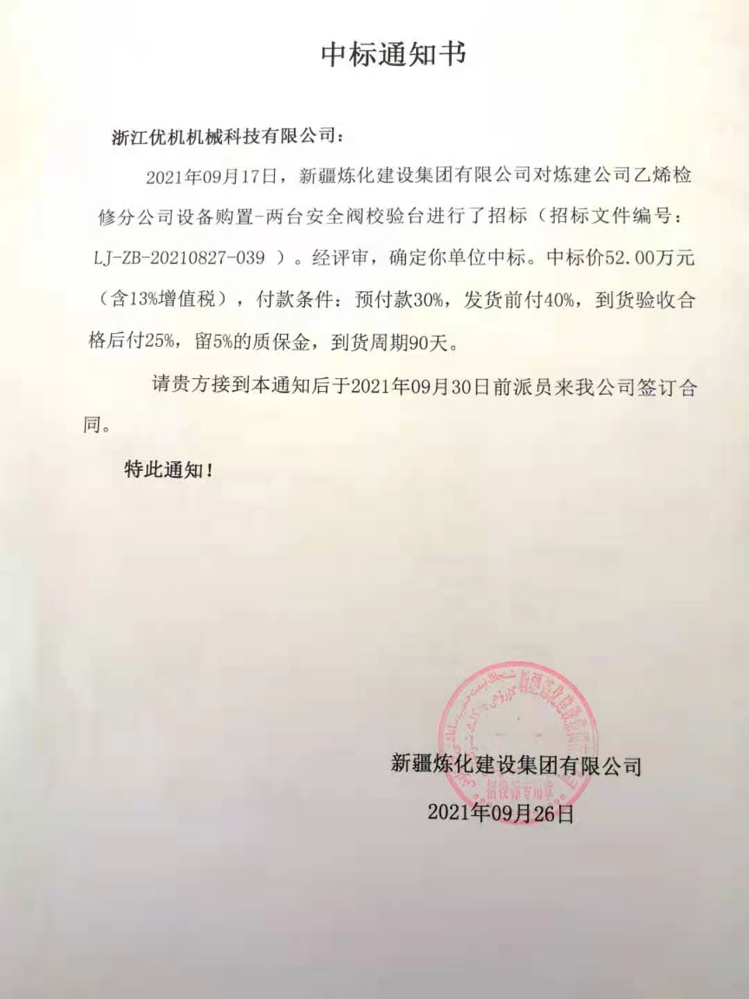 近期,新疆煉化建設集團有限公司發(fā)出中標通知書,宣布通知浙江優(yōu)機機械科技有限公司,二次添加設備購置項目-兩套安全閥校驗臺,經(jīng)評審確定中標(招標文件編號:LJ-ZB-20210827-039),合計一期和二期閥門檢測校驗設備總數(shù)達到11臺(套)金額貳佰多萬,該項目是浙江優(yōu)機機械科技有限公司主營產(chǎn)品進入中石油樣本項目。