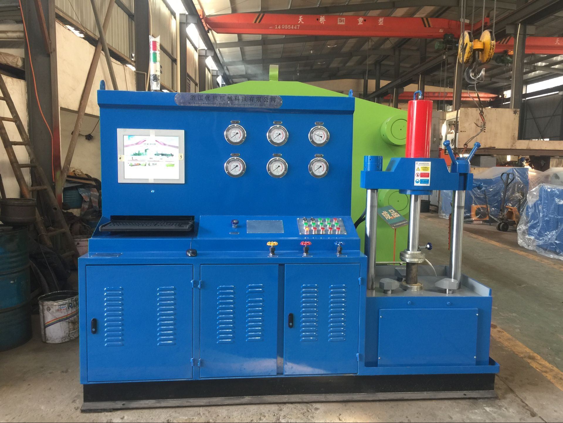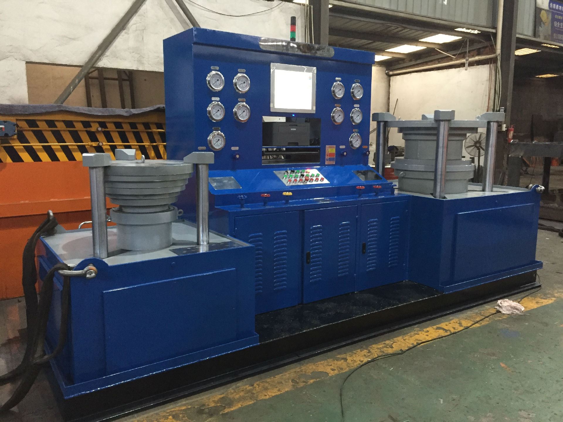 工作過程:根據(jù)閥門的公稱通徑和壓力調(diào)整油缸壓緊壓力——壓緊工件——打開低水泵快速注水——打開高壓水泵——保壓計(jì)時(shí)——卸壓、復(fù)位。